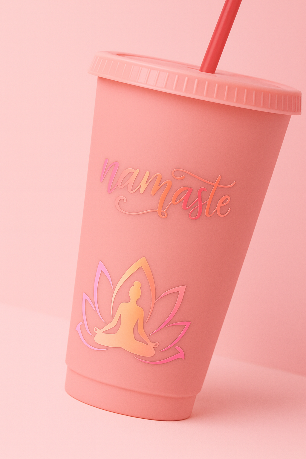 Entdecke den stylischen Trinkbecher in Matt-Pink mit Deckel und Strohhalm – veredelt mit einem holographischen „namaste“-Schriftzug und einer Yoga-Silhouette im Lotusblüten-Design. Der Aufdruck schimmert je nach Licht in wundervollen Pink-, Gold- und Regenbogentönen und macht den Becher zu einem echten Blickfang.