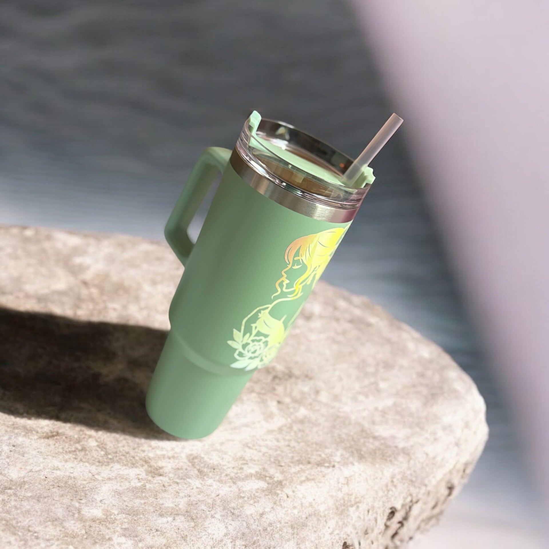 Stylischer Thermo-Becher in einem zarten Mintton mit holografischem Girl-Design. Der doppelwandige Cup hält Getränke lange warm oder kalt und ist perfekt für unterwegs, Büro oder als Geschenk. Elegant, modern und ein absoluter Hingucker.