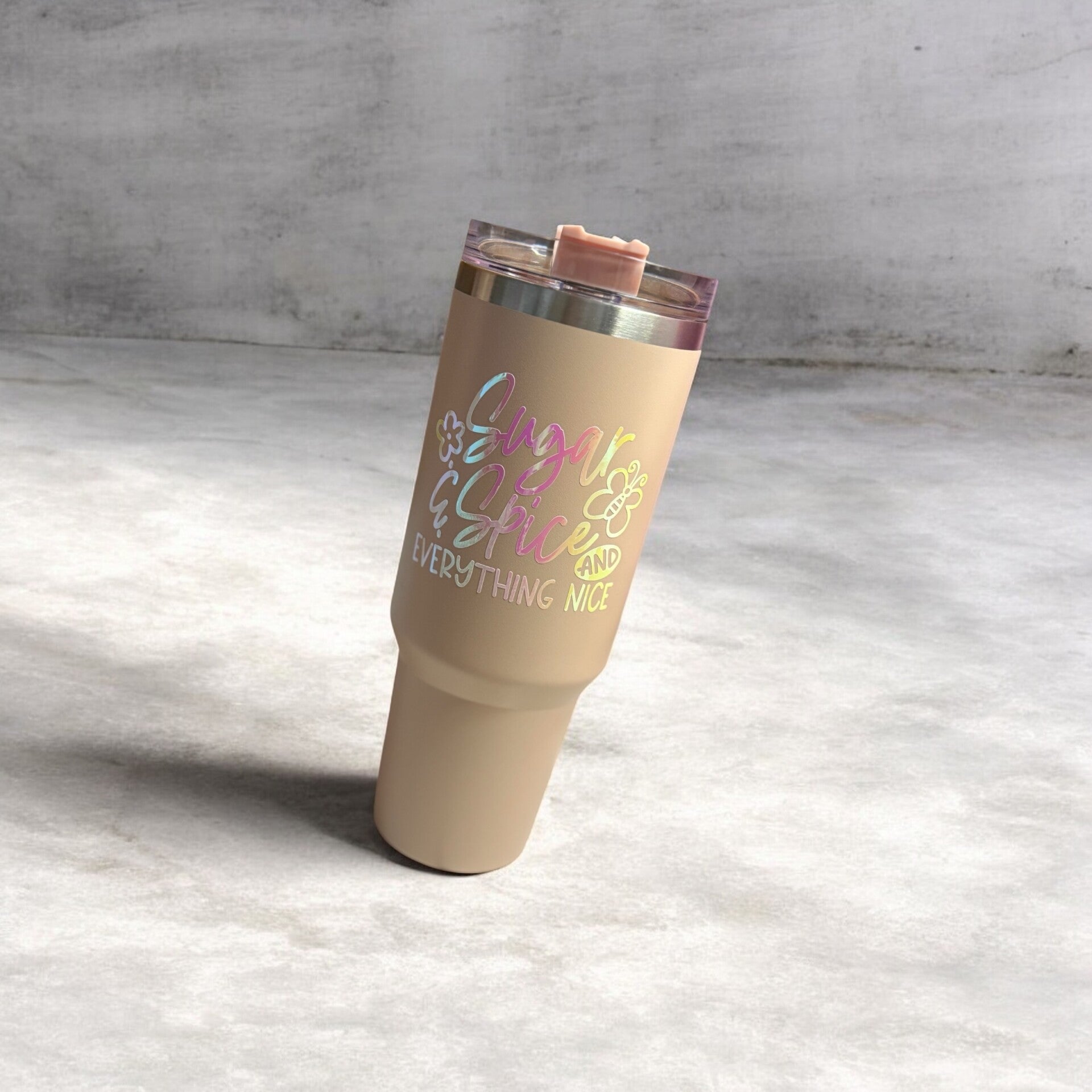 Beiger Thermo-Becher mit süßem holografischem „Sugar & Spice & Everything Nice“-Print. Dank doppelwandiger Isolierung hält er Getränke lange warm oder kalt. Perfekt für unterwegs, Büro oder als liebevolles Geschenk – stylisch, modern und absolut einzigartig.